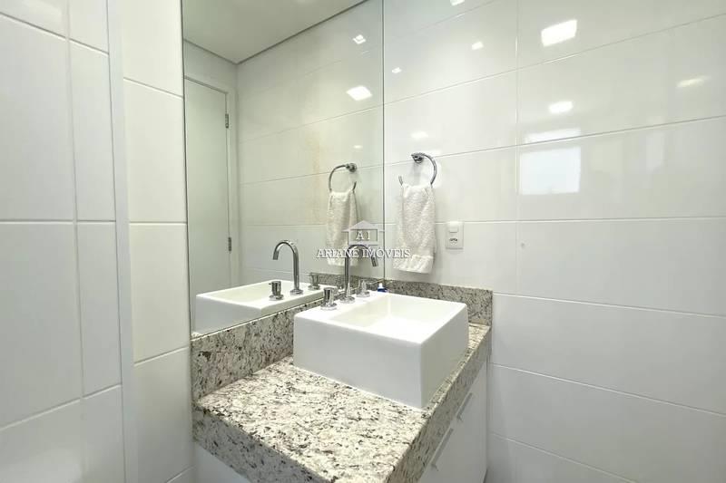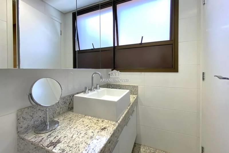 Banheiro social com espelho, bancada em granito, armários e box em blindex
