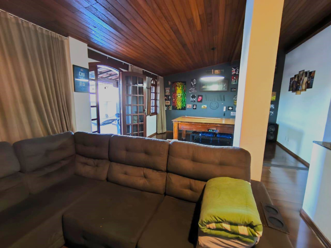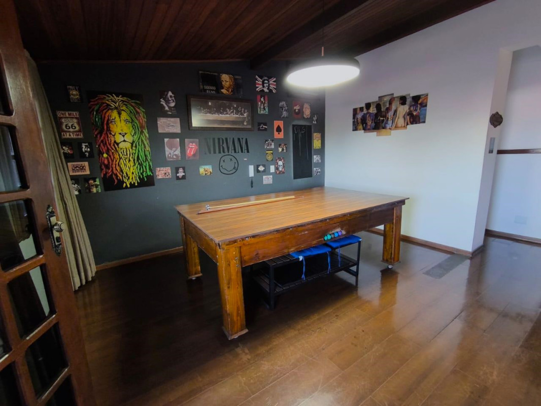 Sala: Ampla sala de televisão integrada com um espaço de sinuca com piso em tábua corrida, ideal para momentos de lazer e diversão.